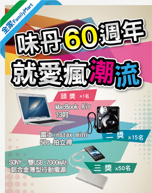味丹60週年 就愛瘋潮流於活動期間,在全家購買任兩件味丹商品(飲品、泡麵系列),憑發票號碼上網登錄,即可參加抽獎。Mac Book Air等3C大獎等你搶!
